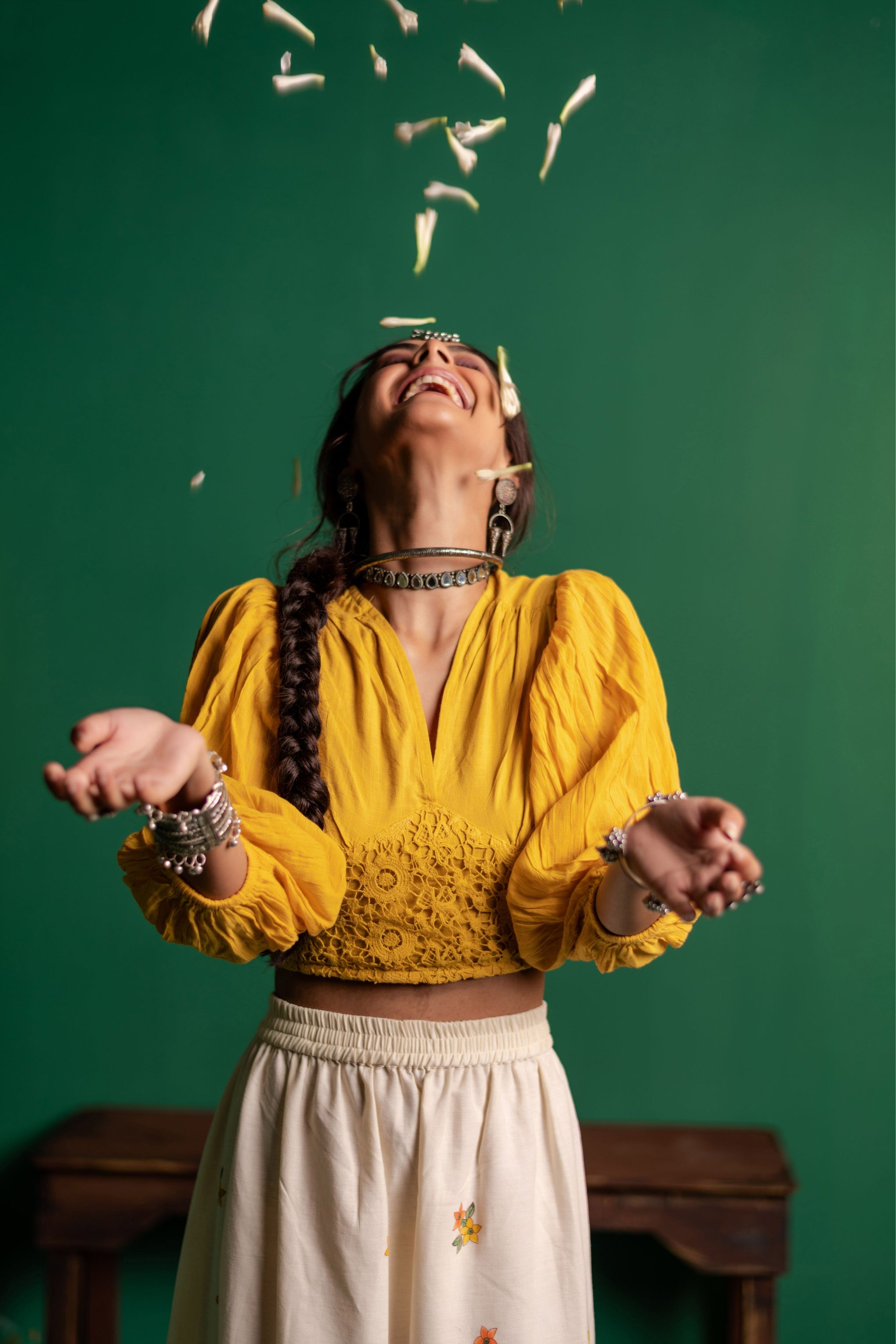 Let sunshine bloom with every step in this yellow floral skirt. Style it with a mustard blouse, rust-toned crop top, or a light embroidered kurti for a grounded, vibrant look.